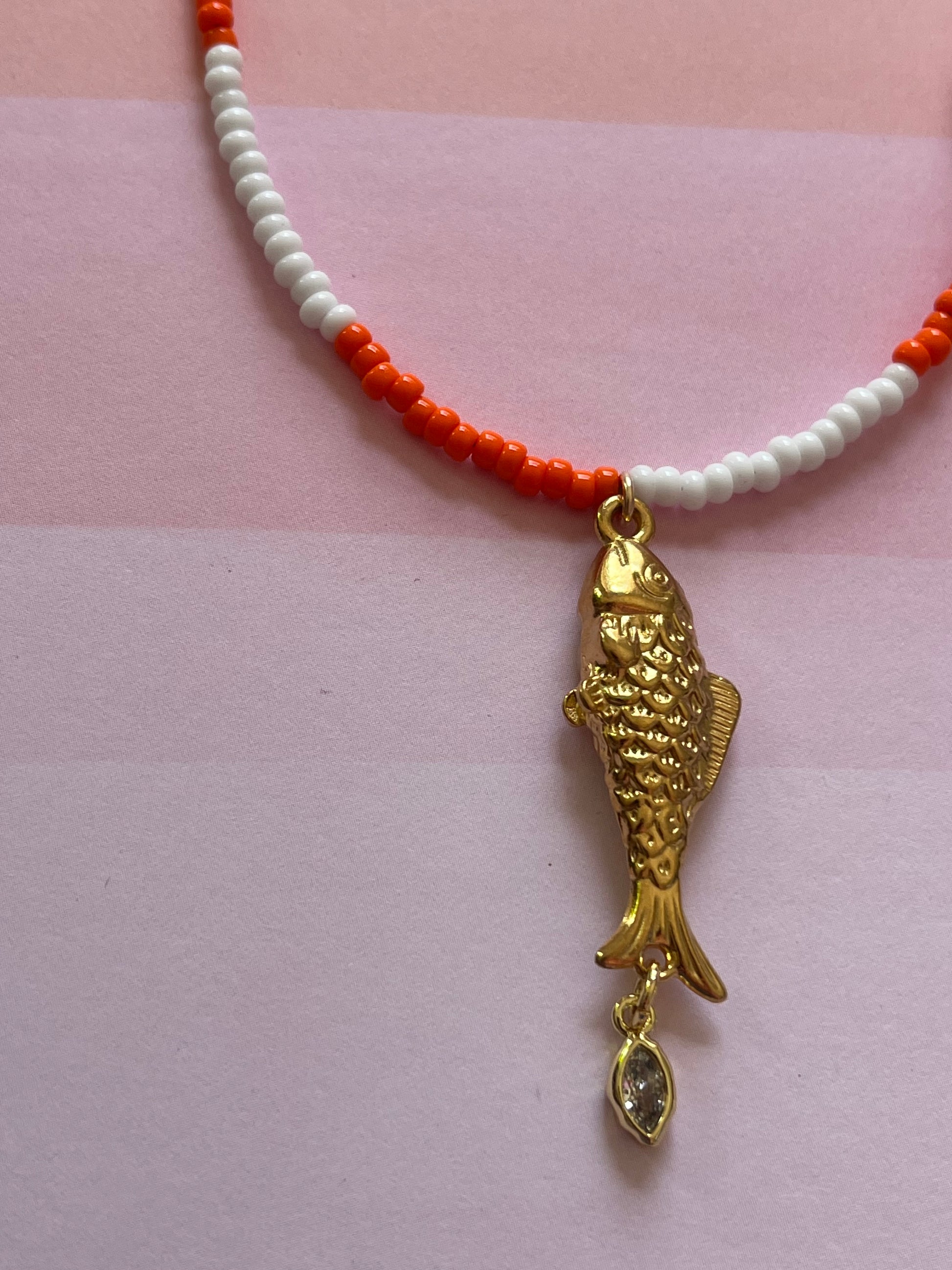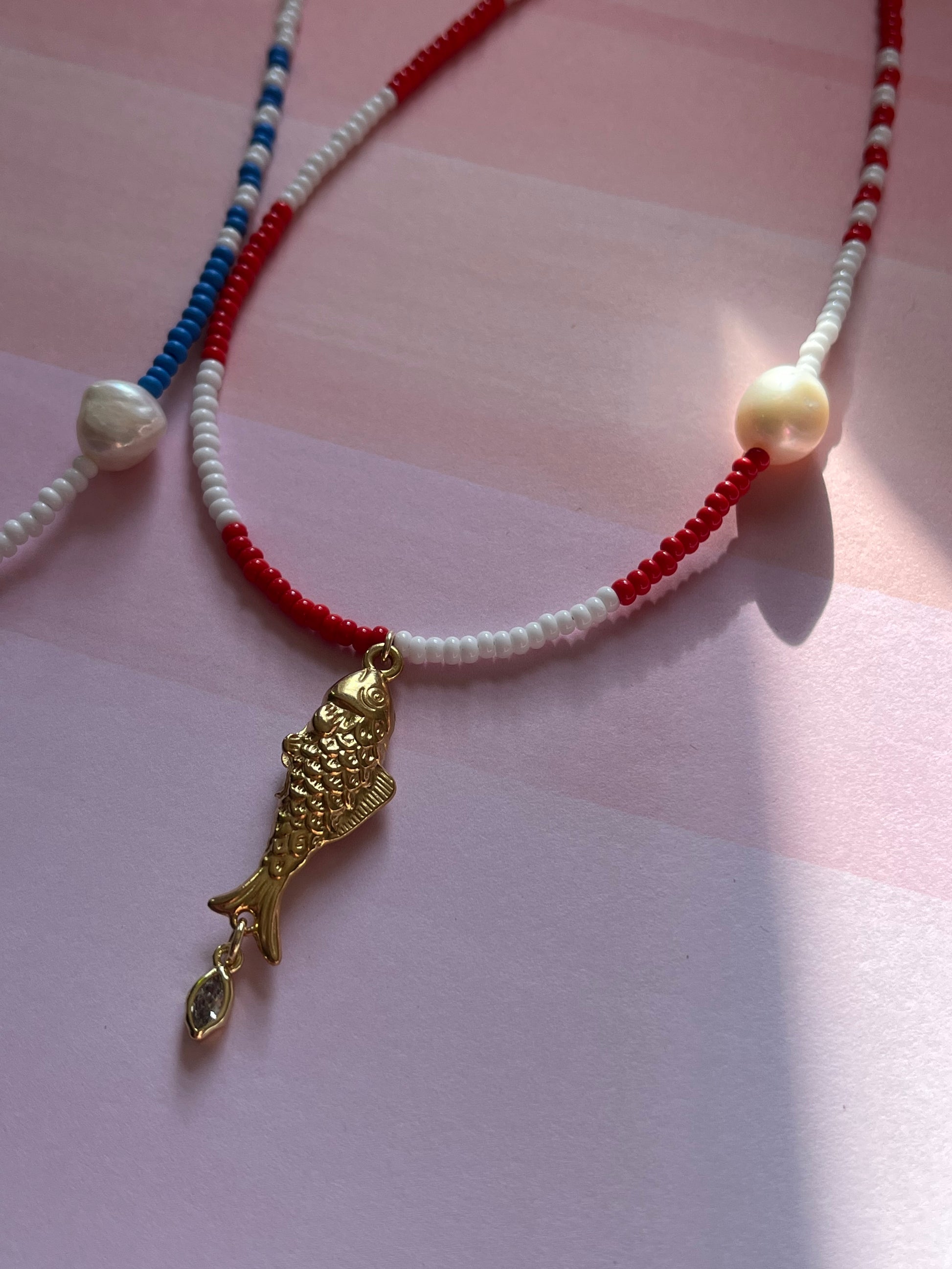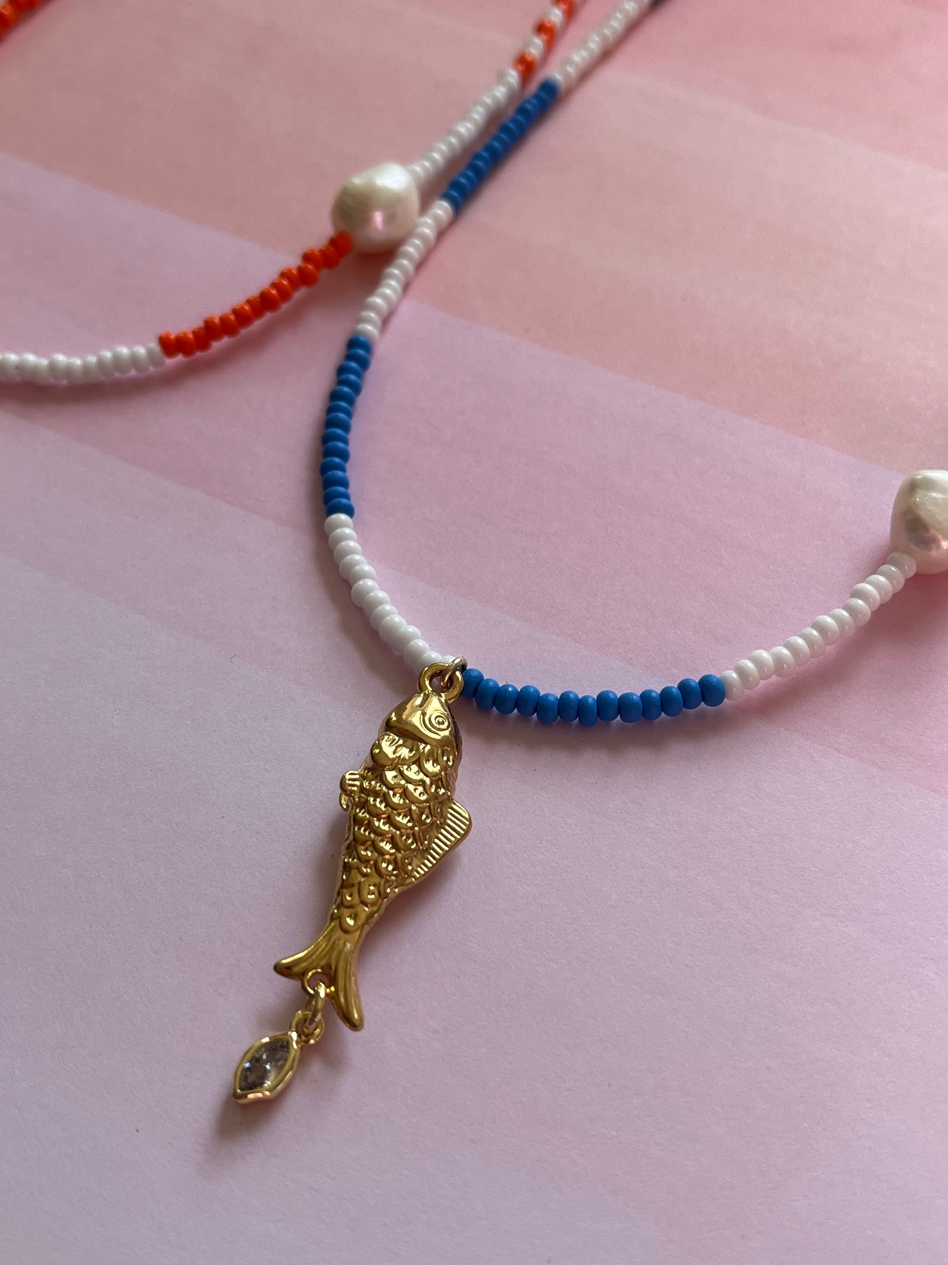 16" czech glass beads with goldfill fish and tiny marquis, baroque pearl. Finished with 18k goldfill clasp and findings.