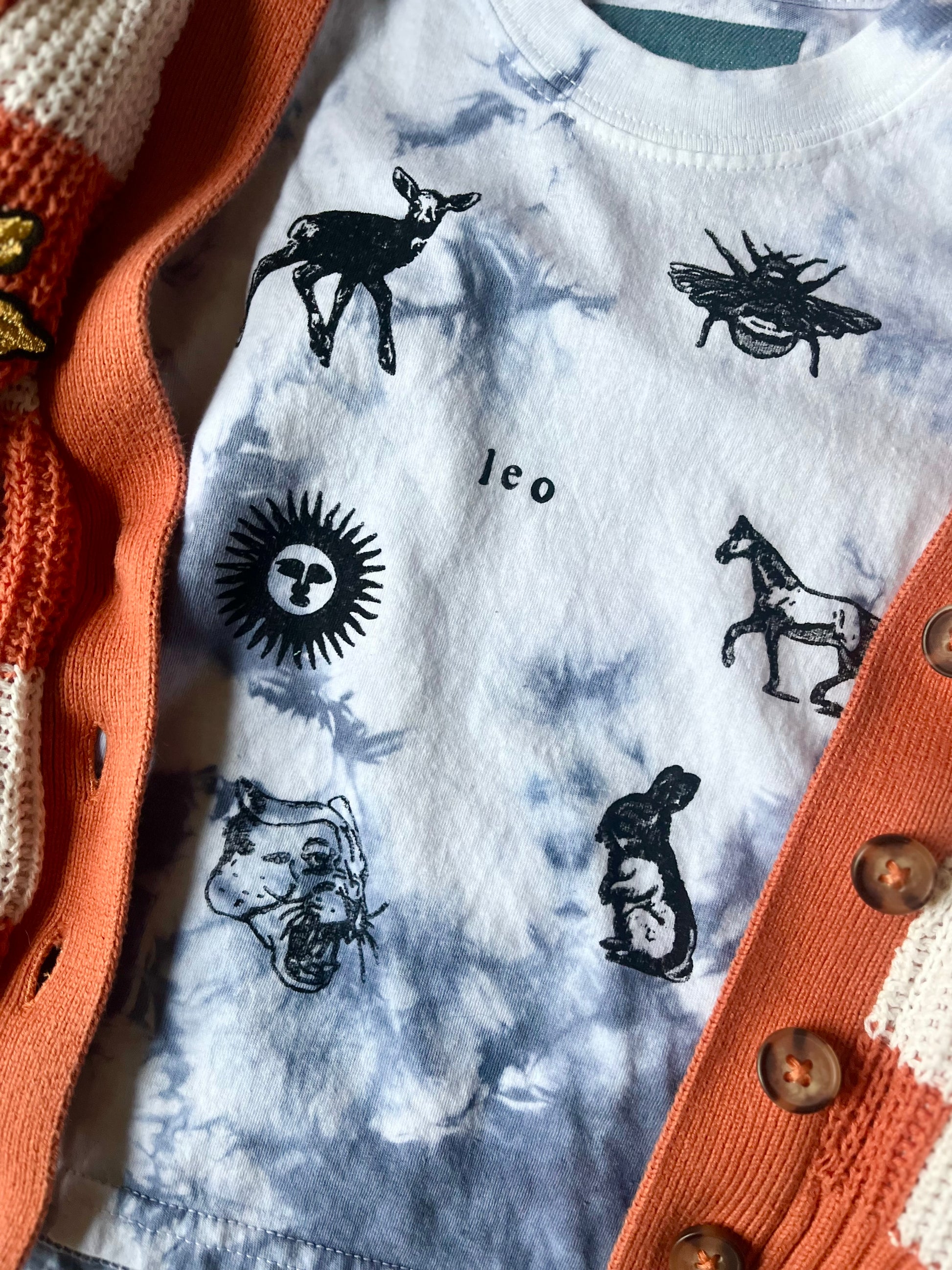 Kids dyed cotton tee shirt, with stamp patch and customized to their name. Simply select size, dye color (indigo blue or cutch brown) and leave a note at checkout with the name you’d like on the shirt.