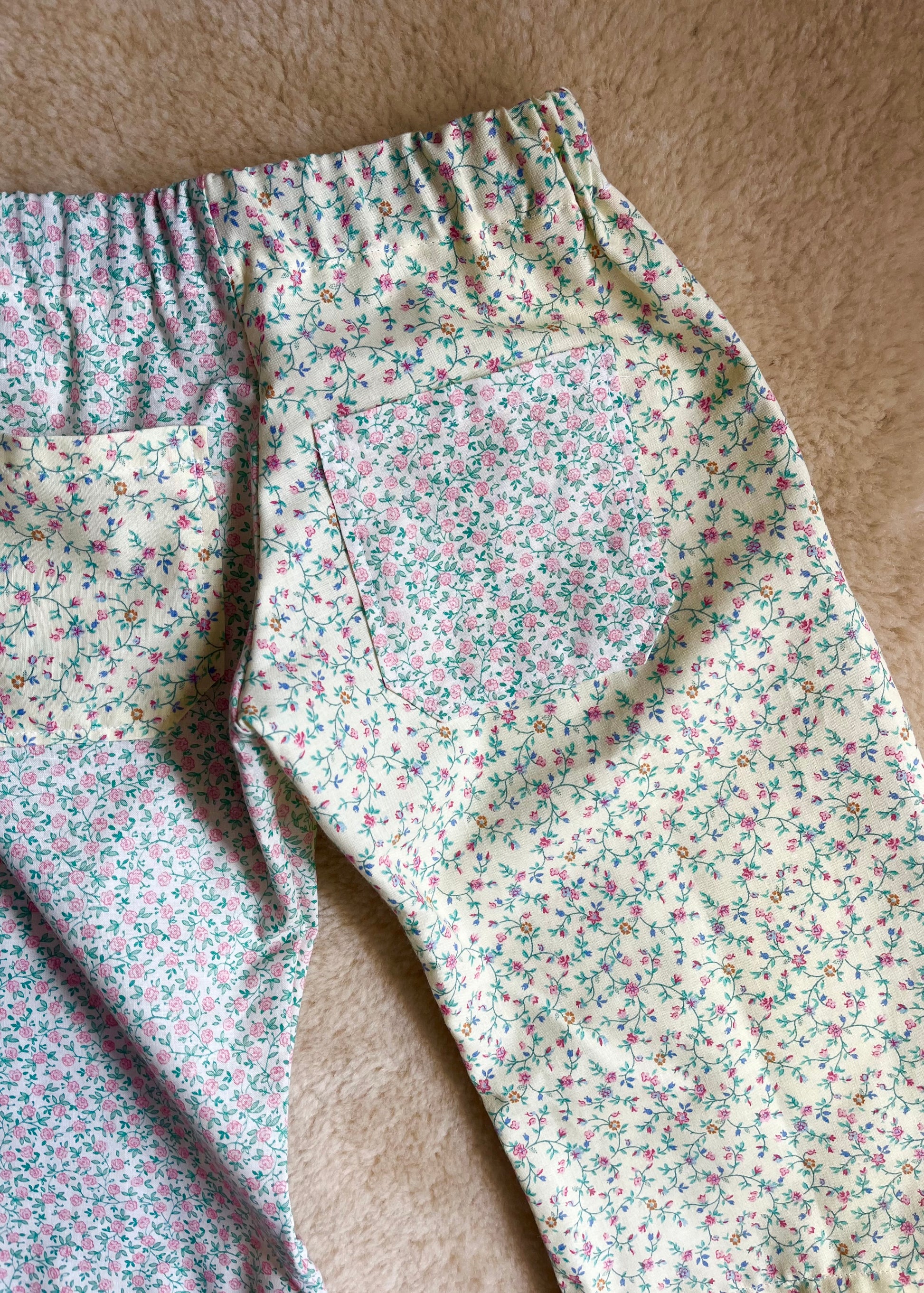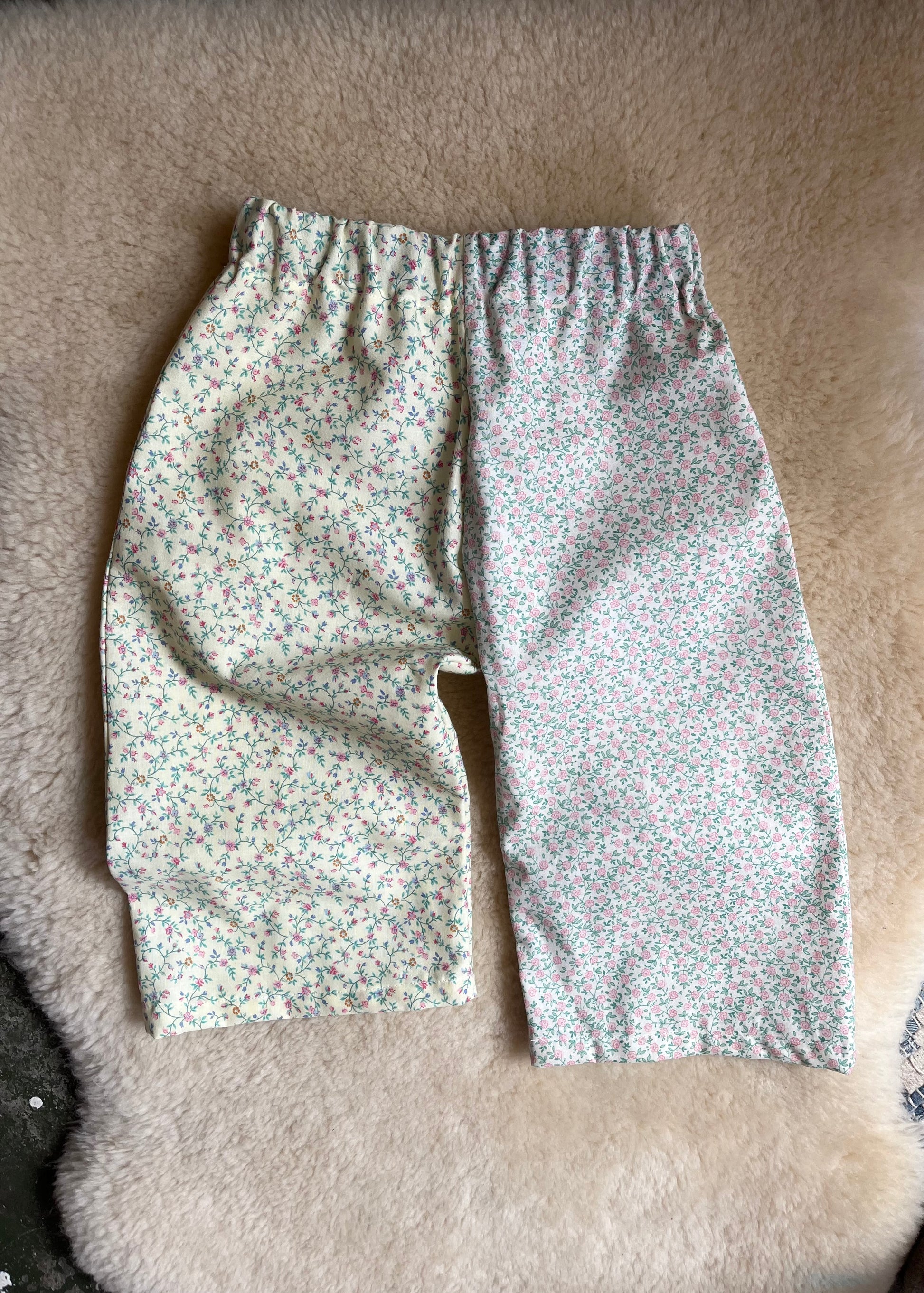 handmade oversized play pants with back pockets. Made from vintage floral tablecloth scraps! Super lightweight cotton, great for spring and summer. Elastic waistband.