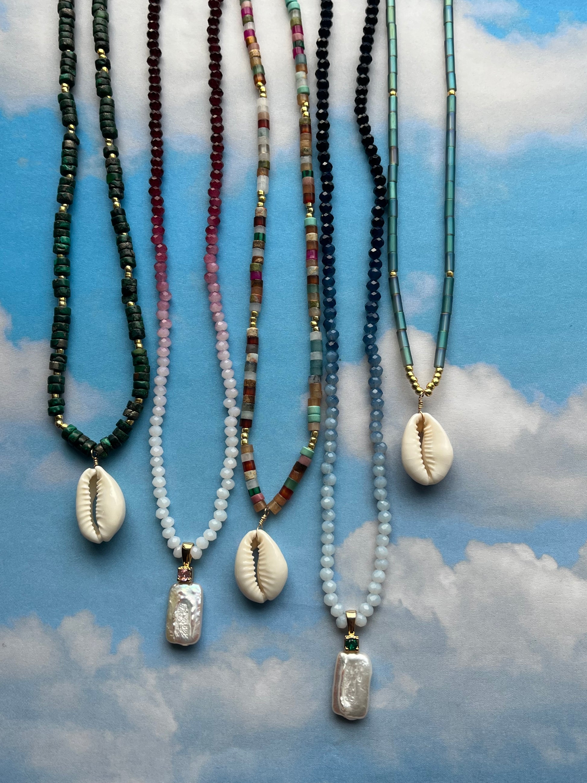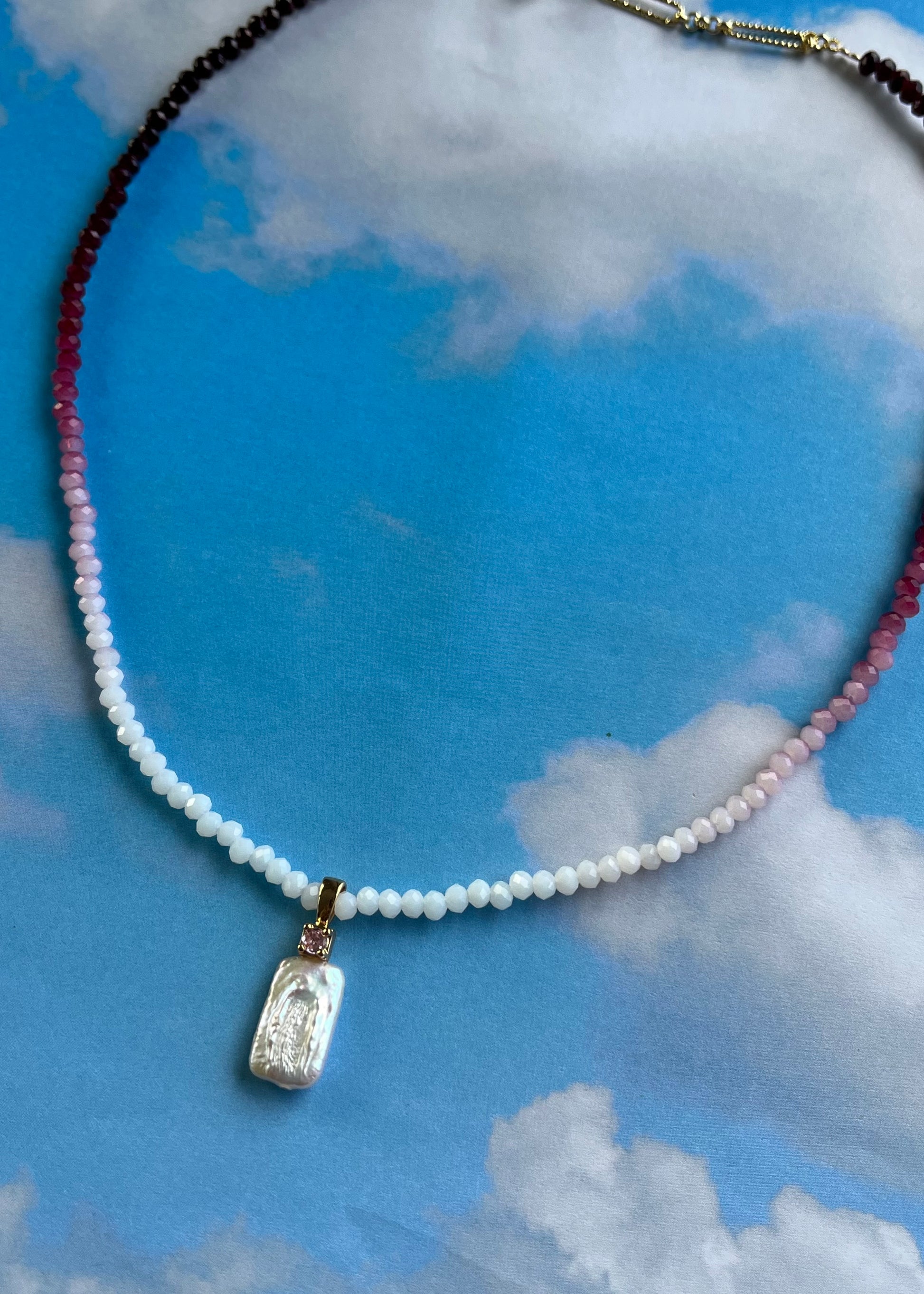 14" ombre pink or blue beads with baroque pearl and CZ. Choose from either blue ombre with green cz pearl, or pink ombre with light pink cz pearl.