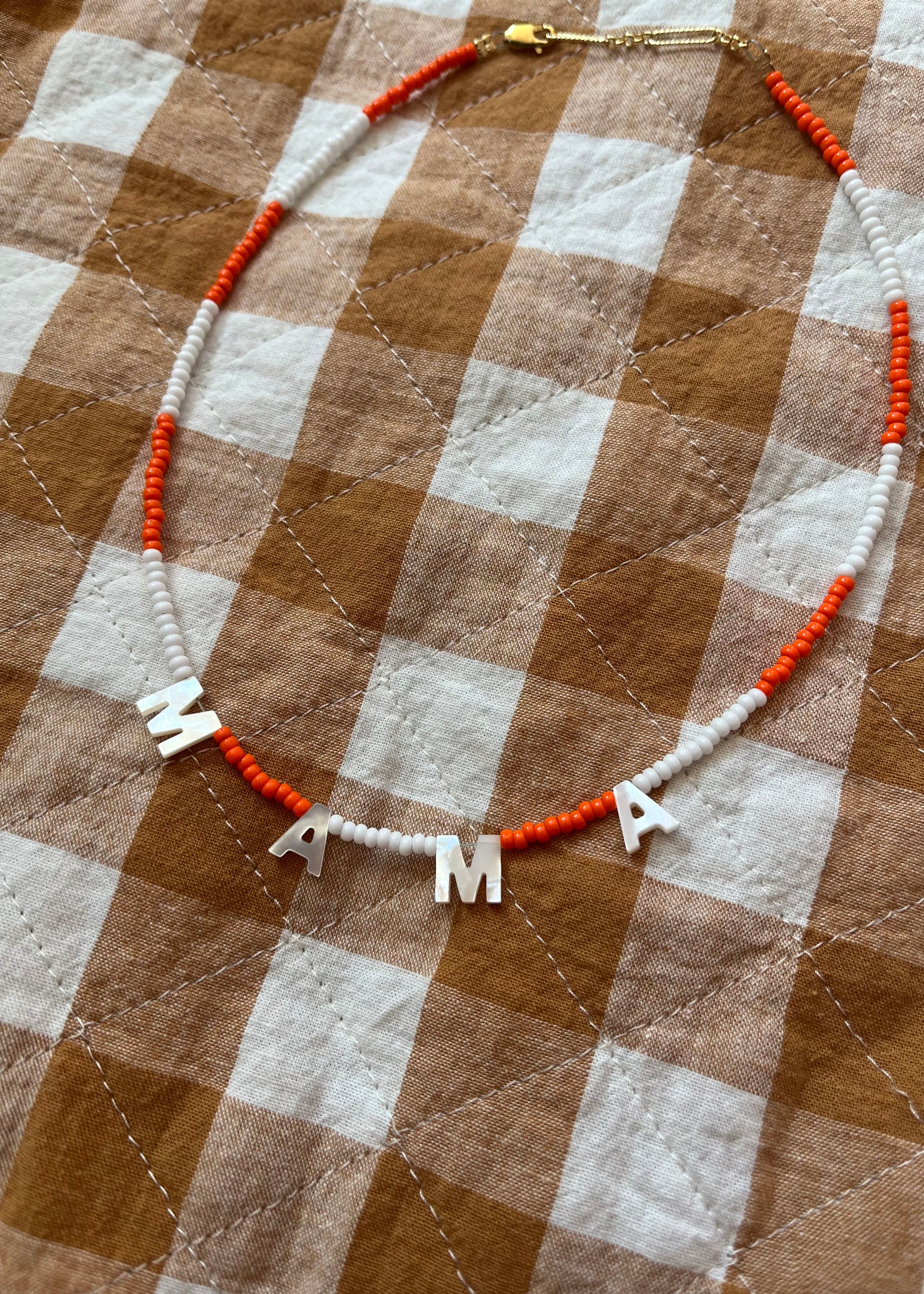 16.5" orange and white czech glass blocked beaded necklace with mother of pearl "mama". 18k goldfill extensions and clasp.
