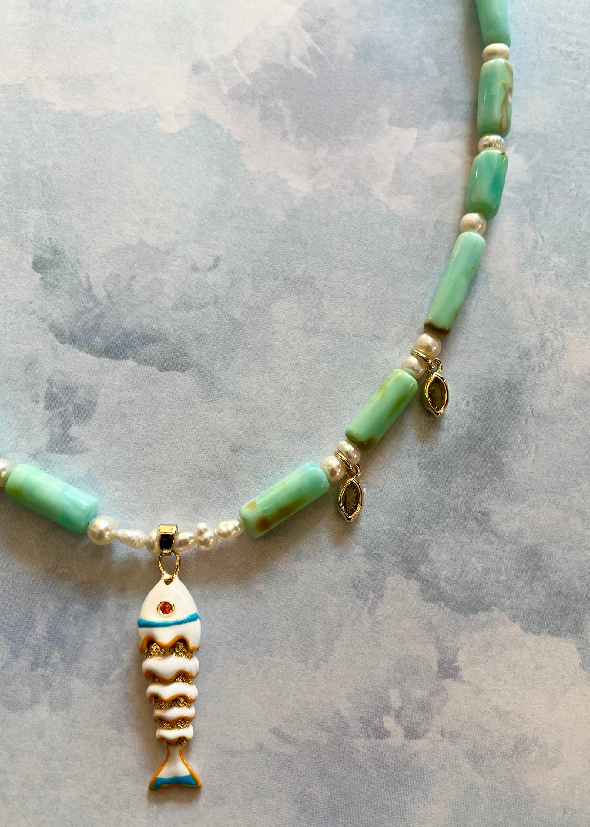 opal, pearl, marquis CZ, and dangling enamel fish. 18k goldfill clasp and extension chain. This item is one of one honey.