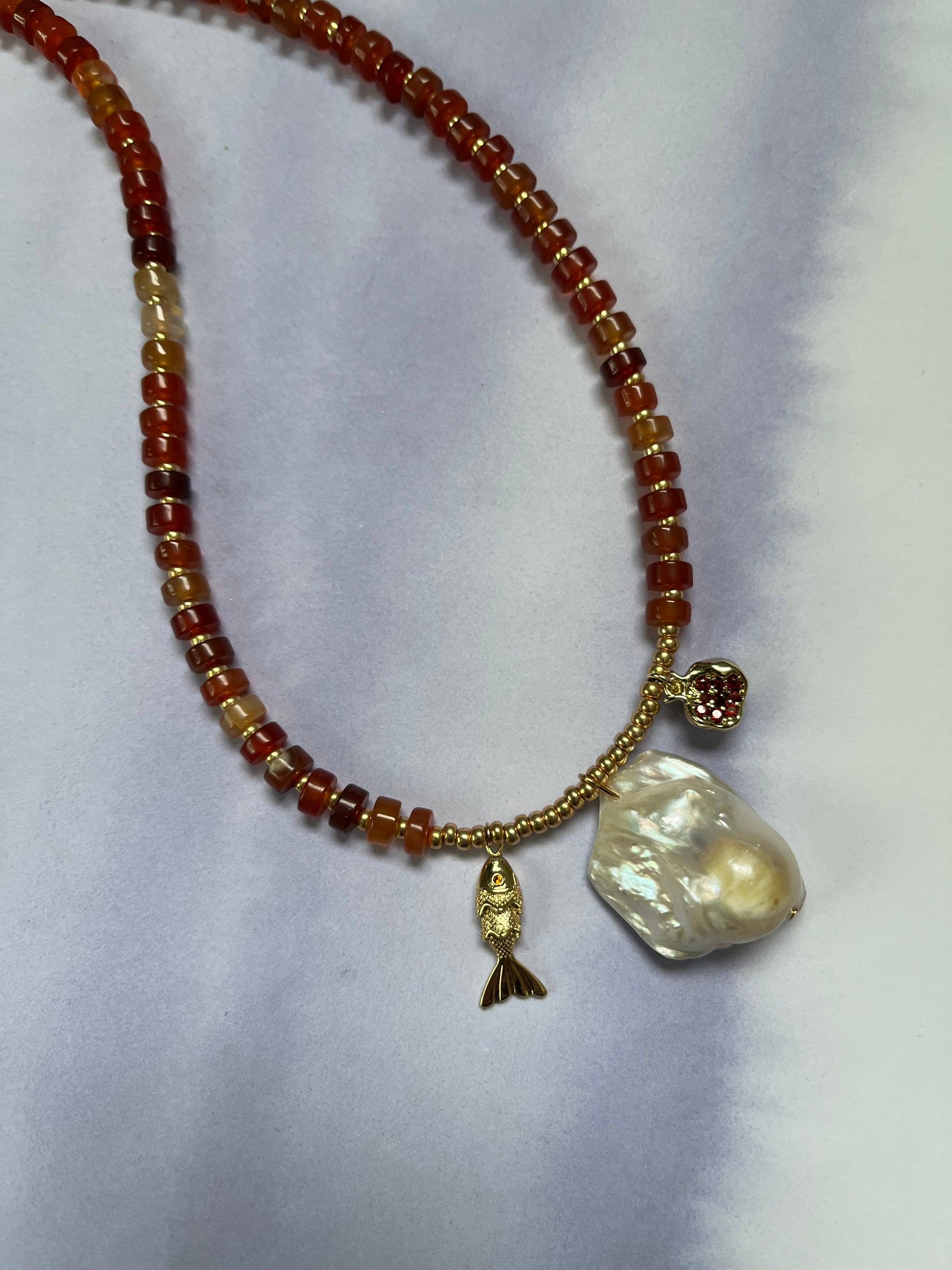 Red fire agate with baroque pearl, goldfill cz pomegranate, and goldfill fish pendant. Finished on a 18k gold fill extension chain and findings.
