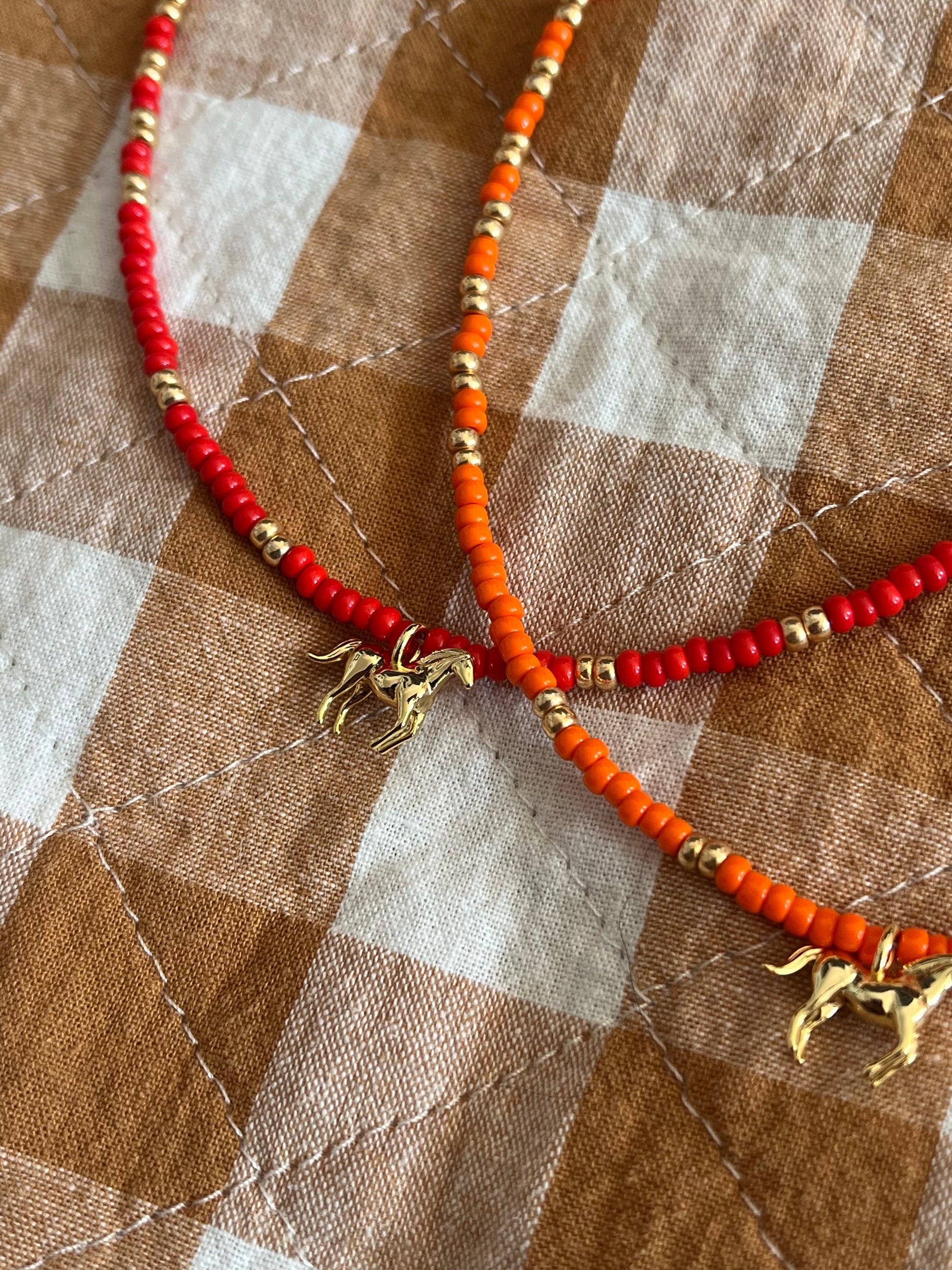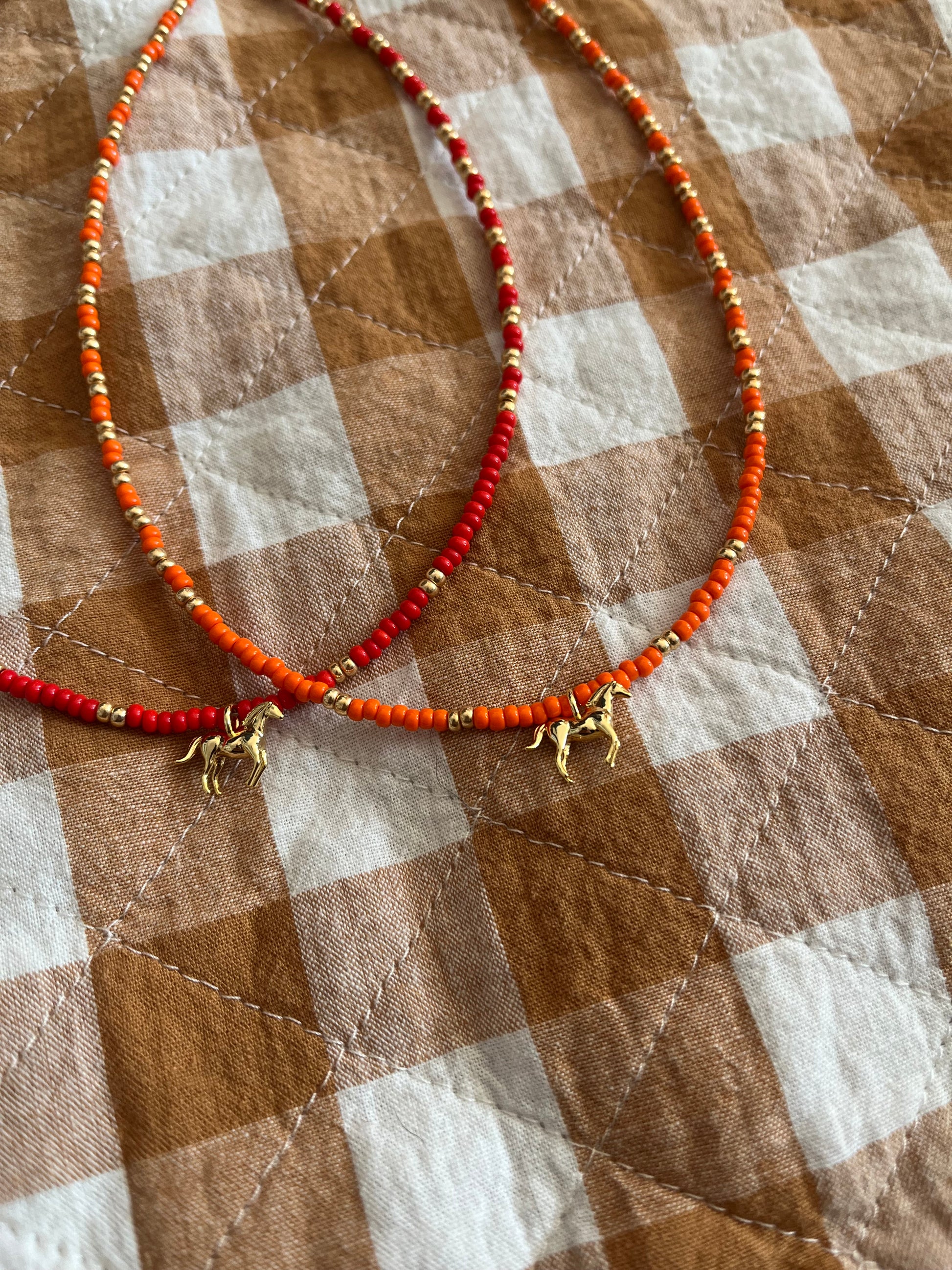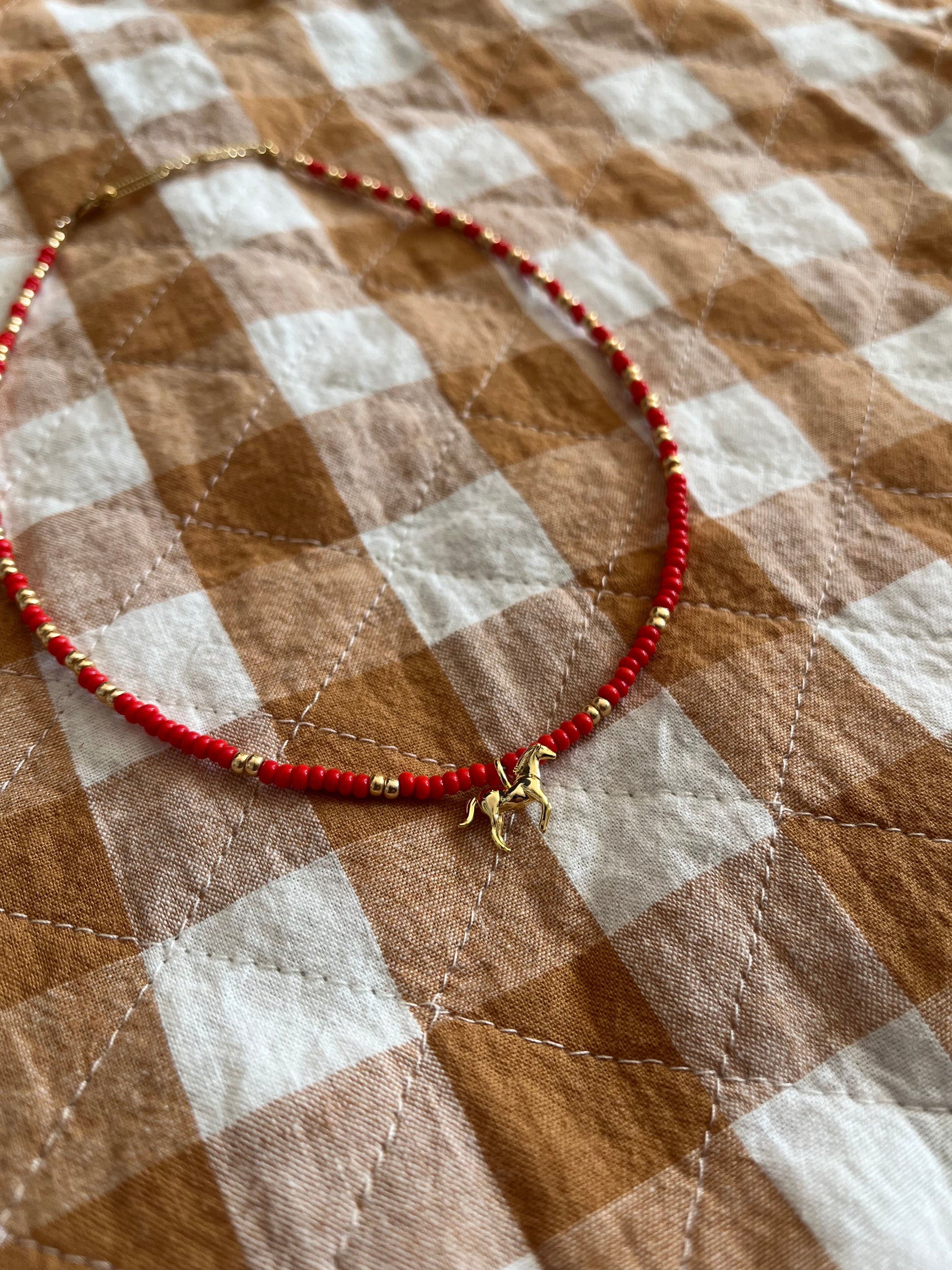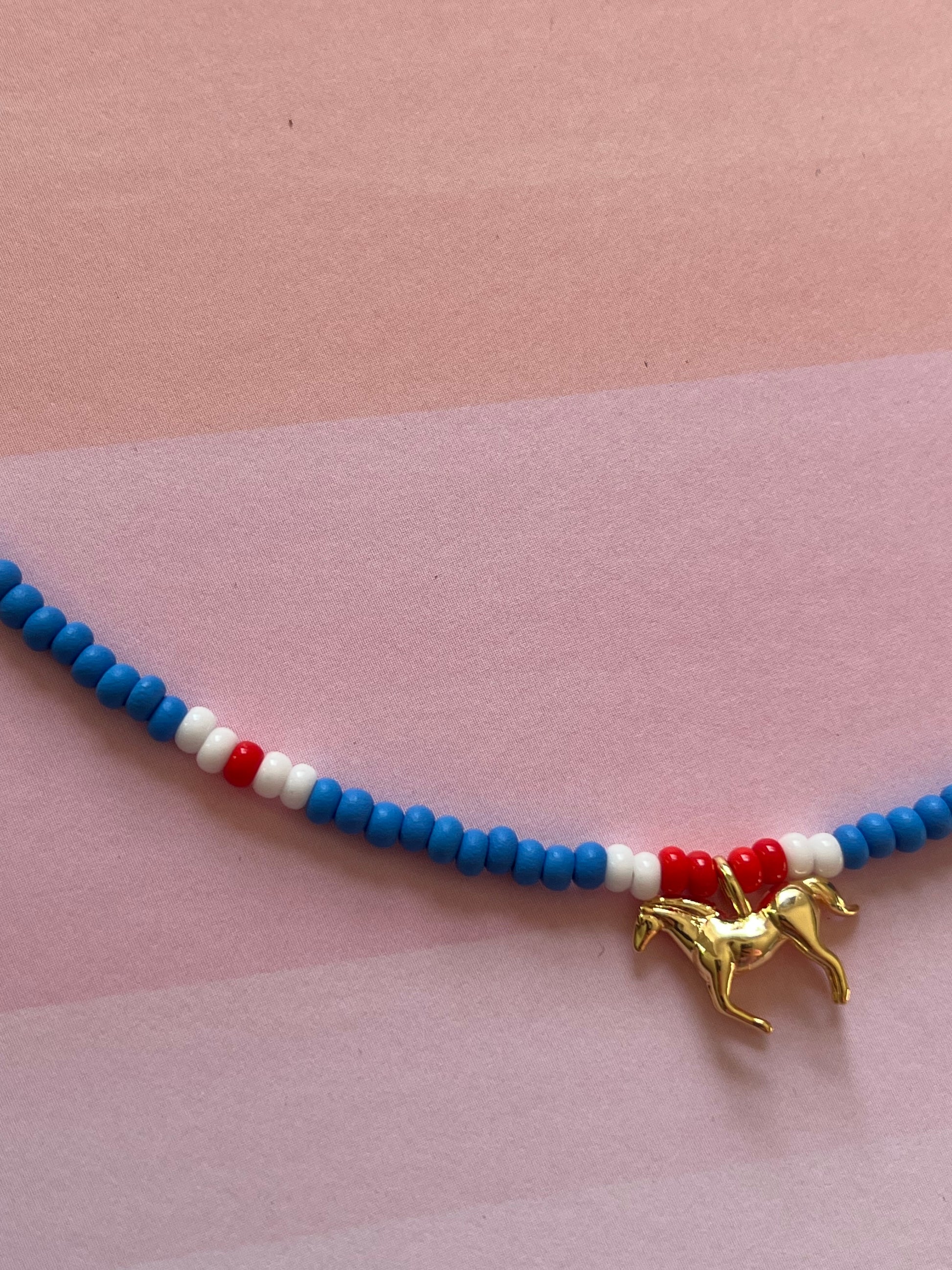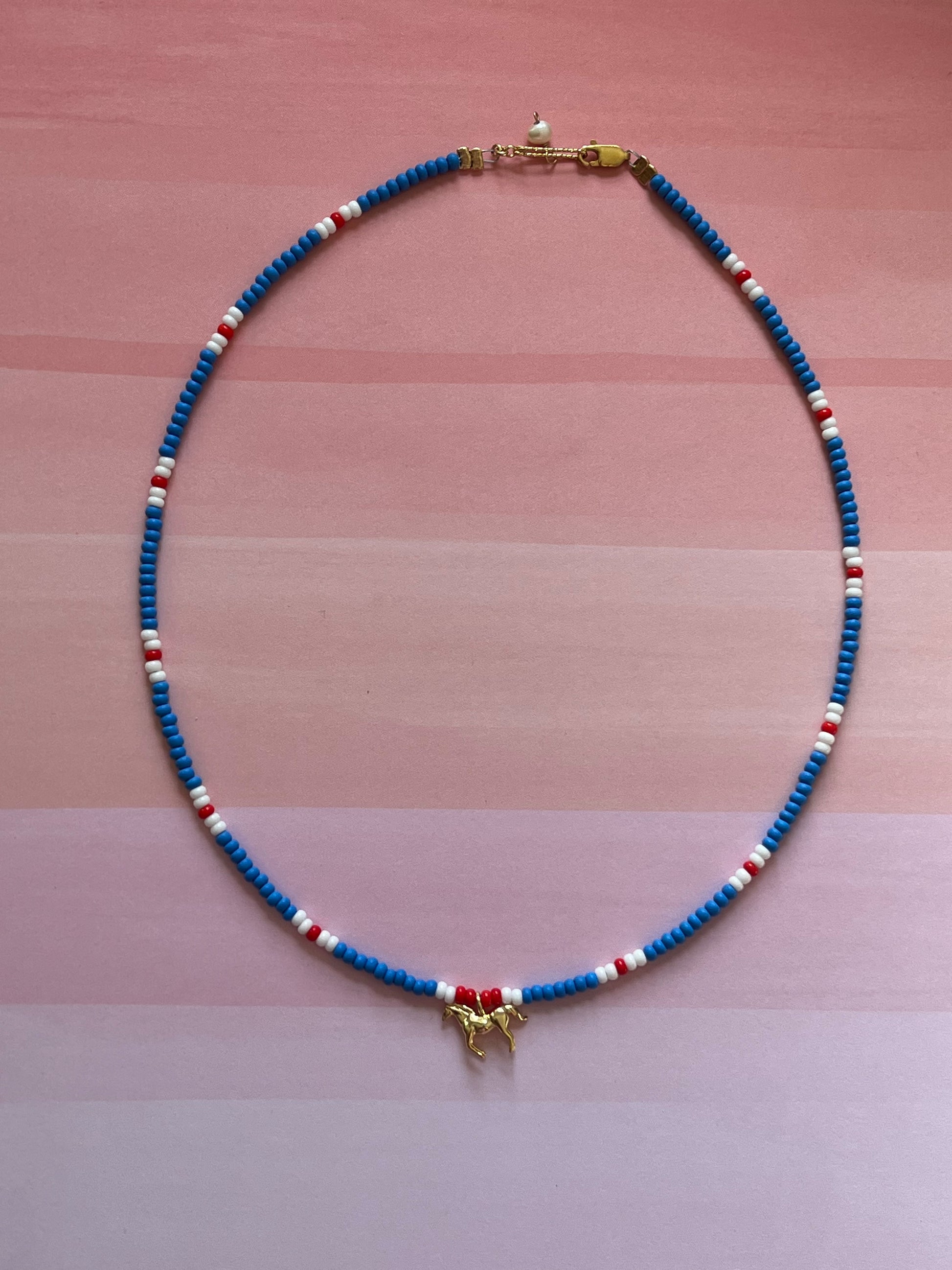 16.5" beaded choker with 18k gold fill horse pendant, extension and findings.
